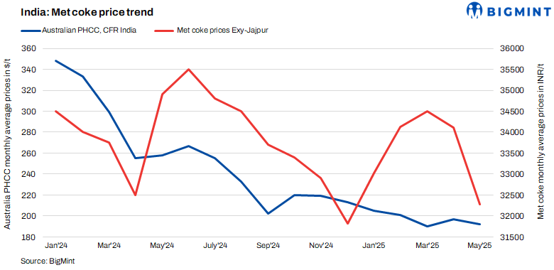 Indian metallurgical (met) coke prices witnessed a notable decline last week, reaching their lowest levels in five months. The price drop is largely attributed to subdued market sentiment, weak buying interest, and growing uncertainty in the downstream steel sector.