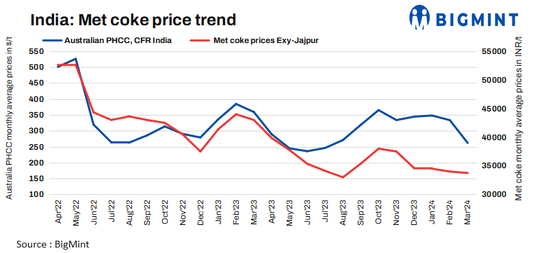 Indian met coke prices have been recorded at INR 33,500/tonne (t) ex-Jajpur this week. Prices dropped by INR 500/t w-o-w. However, the deals have been concluded at levels below 33,000 levels too. Few mills have gone for a shutdown and production is as low as 1,000 tonne (t) per month owing to low purchasing interest by steel mills. Imported met coke prices are still at INR 2,500-3,000/t inexpensive compared to the domestic material.