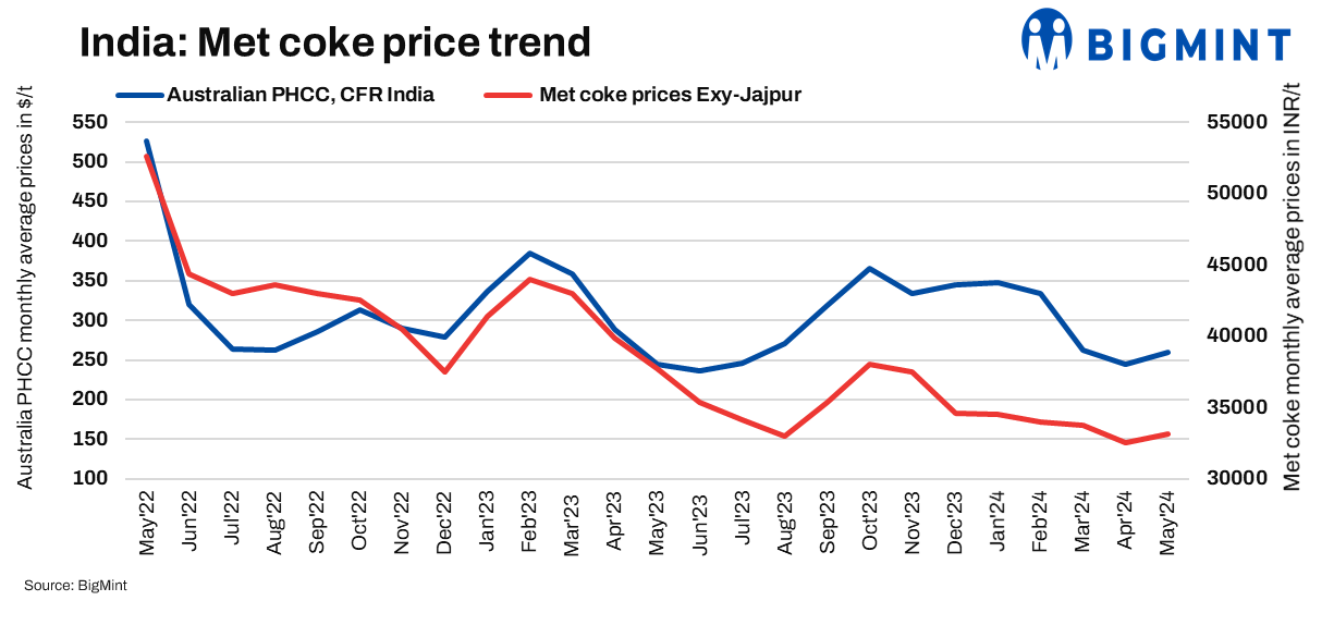 Met coke prices in western India have remained stable. Production has been reduced, with Indian cokeries cutting their output. Consequently, met coke capacity utilisation in western India has decreased to around 50%. Indian met coke production dropped 11% m-o-m in April 2024. Captive production was recorded at 3.37 mnt and merchant producers contributed 0.47 mnt last month.
