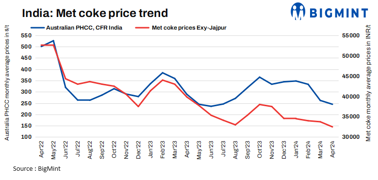 Indian met coke prices for western India are assessed at around INR 33,000/t ex-Gandhidham. Prices are experiencing a downtrend.