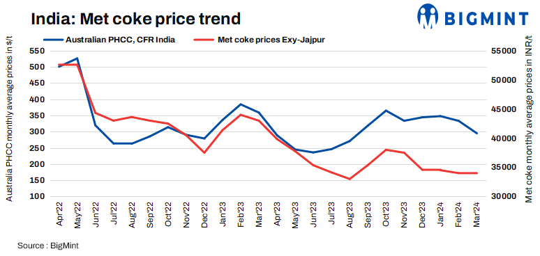 Indian met coke prices have been recorded at INR 34,000/tonne (t) ex-Jajpur this week. Prices remained unchanged w-o-w, reflecting subdued trading activities in the market. Some merchant coke oven plants are operating below capacity and are choosing to blend imported met coke, given the decline in imported offers. Cokeries continued to grapple with high levels of coking coal, resulting in reduced purchases. Moreover, there is a noticeable lack of demand for both coking coal and PCI grades. Few cokeries have also put to halt temporarily on reduced buying activities.