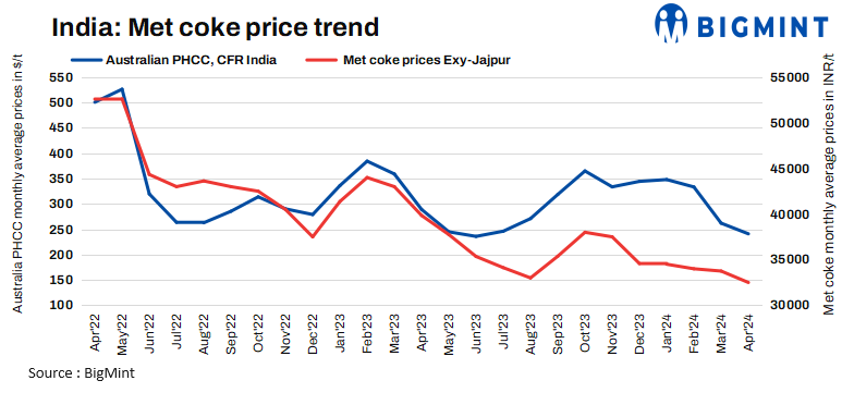 Indian met coke prices have been recorded at INR 32,500/tonne (t) ex-Jajpur this week. Prices remained stable w-o-w. Imported met coke prices are at a lower level as against domestic material availability.