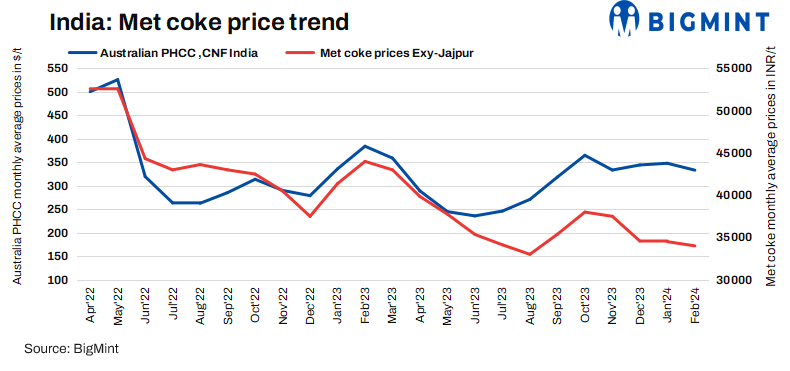 Indian met coke prices have been recorded at INR 34,000/tonne (t) ex-Jajpur this week. Prices dropped by INR 500/t m-o-m compared to INR 34,500/t ex- Jajpur in January 2024.