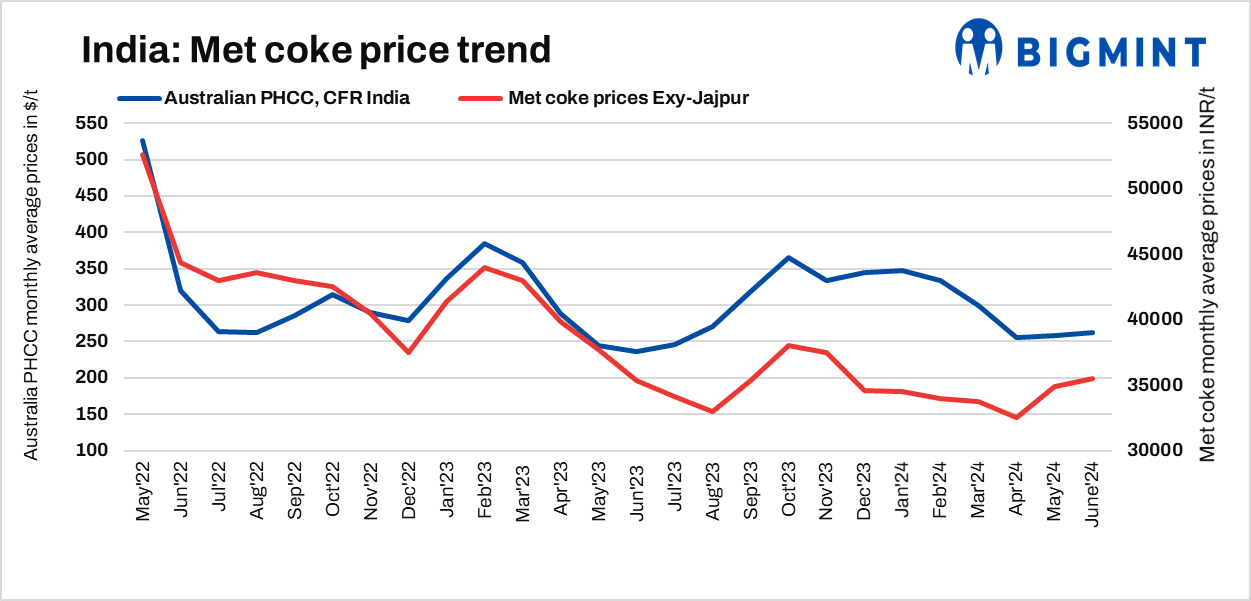 Chinese met coke prices have dropped by $13/t w-o-w to around $297/t CFR India for 64% CSR. Chinese suppliers kept their FOB offers stable in the last couple of days as they await more clarity on a potential domestic coke price increase. The Indian end-users have lowered import bookings for July loading and are into booking August-loading cargoes. For the same reason, import bookings have dropped in the past weeks.