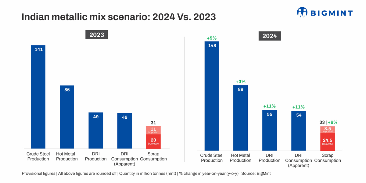 India’s metallic mix for crude steel production continued to evolve in CY’24, shaped primarily by an 11% y-o-y rise in direct reduced iron (DRI) yield, which far outpaced the 3% y-o-y growth in hot metal output. Last year, 50% of India’s crude steel was produced using hot metal, 29% via DRI, and the remaining 21% through ferrous scrap. DRI consumption rose by 11% y-o-y in CY’24, aided by rapid capacity expansion by DRI producers, an increased focus on sustainable steel production, lower imports of scrap amid protectionist trade policies globally, and availability and pricing concerns.