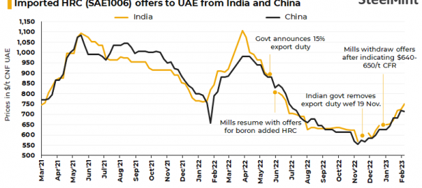 An Indian steel major booked around 20,000 t of HRC for exports to the Middle East for Mar’23 delivery. The deal was closed at $750/t CFR last weekend, as per sources. HRC export prices have risen by $25/t compared with price levels prevailing in the beginning of last week.
