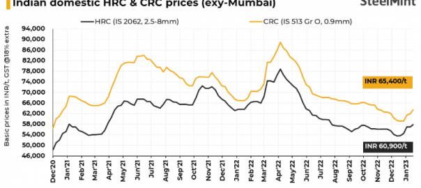 2. HRC trade-level prices surge: Prices in the trade segment have continued to rise. SteelMint’s benchmark assessment for HRCs (IS2062, 2.5-8mm) increased by about INR 2,800/t ($34/t) to INR 59,700/t ($708/t) exy-Mumbai in end-January in comparison to the levels seen in early January. Moreover, mills had announced interim hikes during the month amid the continual increase in trade-level prices.