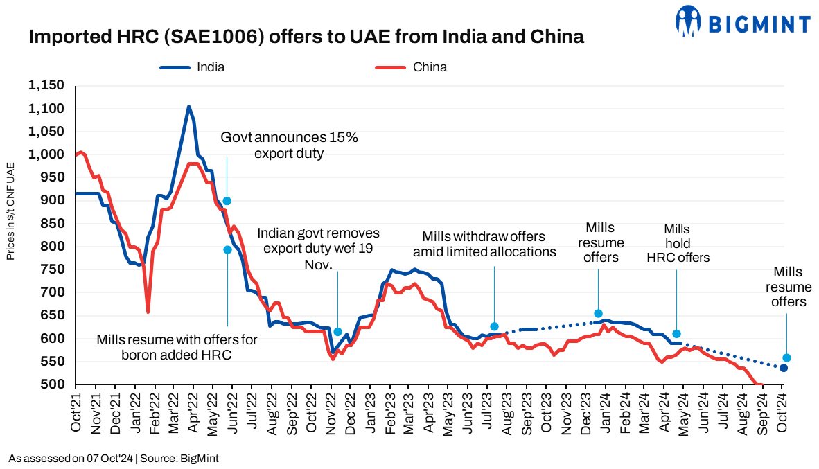 Some Indian steel mills have resumed HRC (SAE1006) export offers to the Middle East after a long pause, with quotes at around $530-540/t CFR UAE. A deal of around 10,000 t was heard concluded at $530/t CFR UAE for Nov’24 shipment.