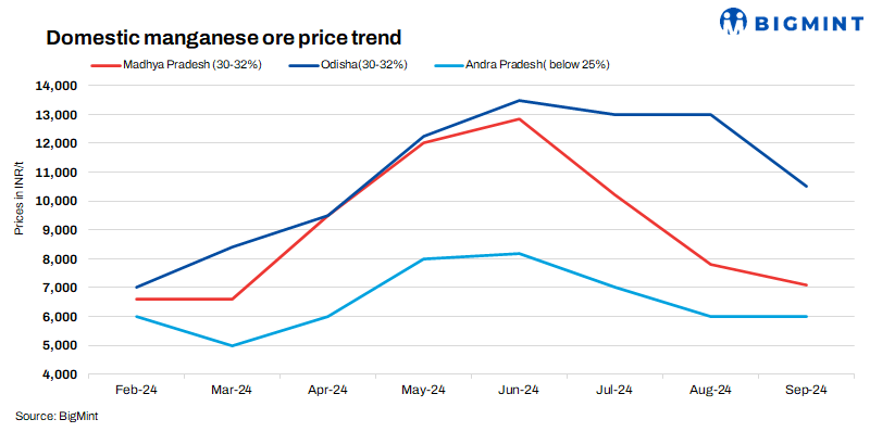 Imported manganese ore offers to India at 6-month lows: Imported manganese ore offers to India hit six-month lows in August 2024. Offers for the benchmark Mn37% lumps from South Africa to India fell to $4/dmtu, the lowest since end-February 2024. The high-grade imported Mn ore is hovering at over-three-month lows of $6.2-6.65/dmtu. Since imported ore provides a direction for domestic pricing, a downward pressure is expected next month.