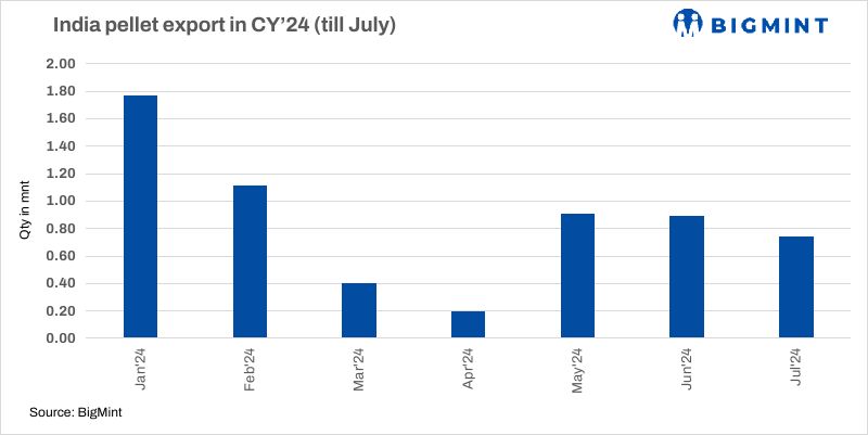 An eastern India-based pellet producer recently finalised two export deals, each for 75,000 t of pellets (Fe63%, 8% SiO2+ Al2O3). The deals were heard to have concluded recently at around $110-110.25/t CFR China for the September shipment, as per BigMint sources. Recovery in global iron ore prices in China have pushed up pellet export prices by $5-7/t in the last couple of trading sessions.