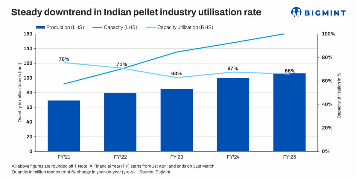 Morning Brief: The Indian pellet industry has seen a steady decline in production capacity utilisation rates between FY’21 and 7MFY’26, with a cumulative drop of 10% in capacity utilisation rate, as per BigMint data.