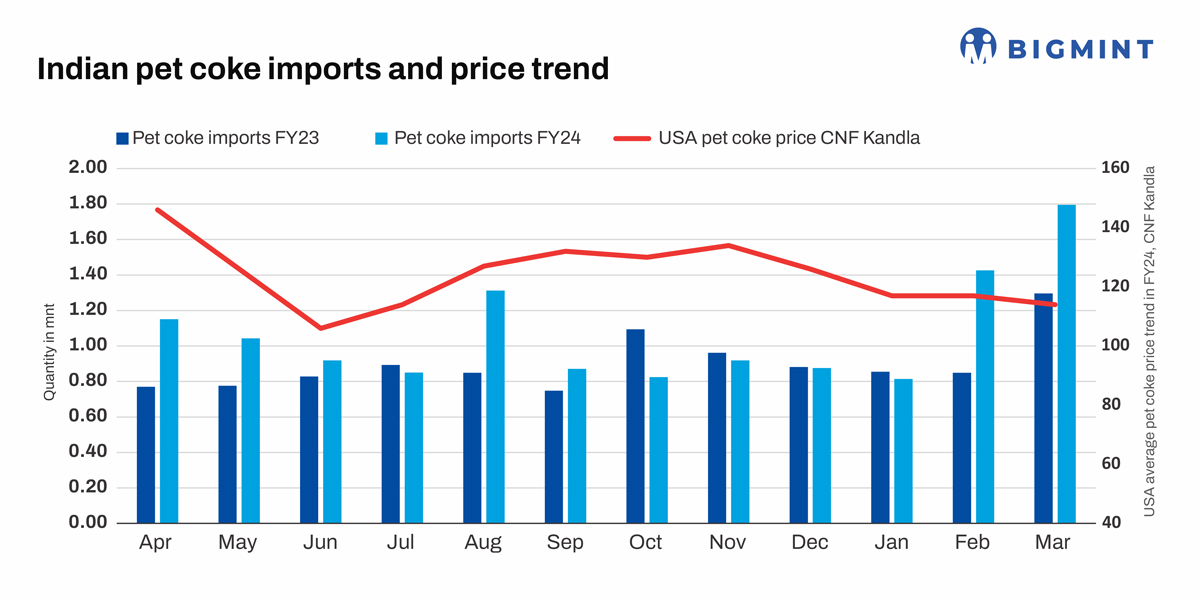 India’s imports of pet coke surged by 18% y-o-y to reach 12.8 million tonnes (mnt) in FY’24, compared to 10.8 mnt in FY’23, as per BigMint data.