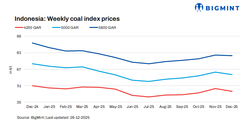 Indian portside prices of Indonesian thermal coal remained largely stable on a week-on-week basis in the week ended 26 December, as subdued spot buying activity limited price discovery across major grades. According to BigMint’s latest assessments, 5,000 GAR coal was unchanged at INR 7,200/t at Kandla and INR 7,100/t at Vizag. Prices for 4,200 GAR softened marginally by INR 100/t, assessed at INR 5,700/t at Kandla and INR 5,600/t at Vizag, while 3,400 GAR coal remained steady at INR 4,500/t at Navlakhi. The broadly flat trend reflects cautious procurement strategies adopted by buyers amid comfortable supply availability.