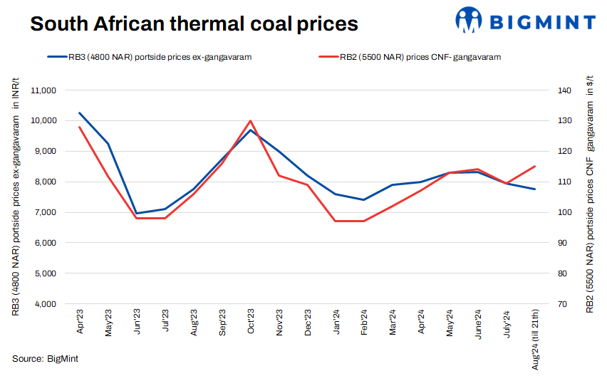 Prices of the South African RB2 (5500 GAR) coal remained unchanged w-o-w at INR 9,650/t ex-Gangavaram. Prices of RB3 (4800 GAR) coal remained stable at Gangavaram and Vizag ports stood at INR 7,700-7,750/t. Transaction remained limited on lower bids by buyers.