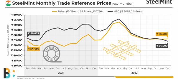 Morning Brief: India’s rebar prices have overshot hot rolled coil (HRC) prices by a record INR 2,400/tonne (t) after a gap of almost three years. HRCs traditionally command a price higher globally compared to rebar and this trend is replicated in India too. However, in December, 2022, as per data maintained with SteelMint, the average monthly price of rebar was at INR 56,400/tonne (t) ($682/t) while HRC slid down to INR 54,000/t ($653/t). The last time rebars were more expensive than HRCs was in March 2020, at -INR 2,250/t ($27/t). It may also be mentioned the spread had hit an all-time high, at nearly INR 16,000/t ($192/t) in June 2021.