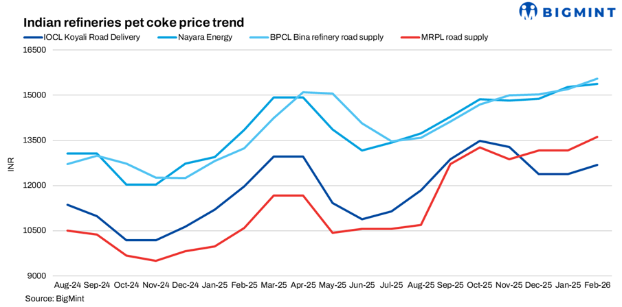 Indian refiners largely revised petcoke prices upward for February 2026, marking a broad-based firming across public and private sector players. The increases followed January’s mixed strategy, when IOCL had rolled over prices while others had raised offers. Imported pet coke price indications from US have shown an upward trend since Dec’25. Prices have risen by $5 so far in Feb’26. Higher freight costs and supported demand have pushed offers high.