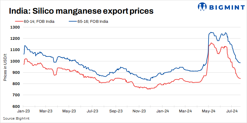 BigMint’s assessment on 23 July, 2024, indicated a sustained downward trend in Indian silico manganese export prices. The SiMn 65-16 grade experienced a $20/t decline to $985/t FOB, while the SiMn 60-14 grade fell by $20/t to $845/t FOB (Haldia/Vizag). This further accentuated the softening of the Indian silico manganese market.