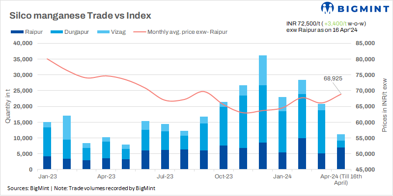 The price surge was evident across grades. Grade 60-14 witnessed a w-o-w increase of INR 2,200-2,400/t ($22-40/t), settling at INR 70,500-72,500/t exw ($842-866/t) in key production regions. The premium grade (60-15) reached INR 73,000-74,500/t ($872-890/t) exw in Durgapur and Raipur, as per BigMint’s assessment on 17 April, 2024. Increased offtake by domestic steel mills is providing a solid foundation for the price rise and a surge in inquiries from overseas markets for Indian silico manganese is further bolstering domestic prices.