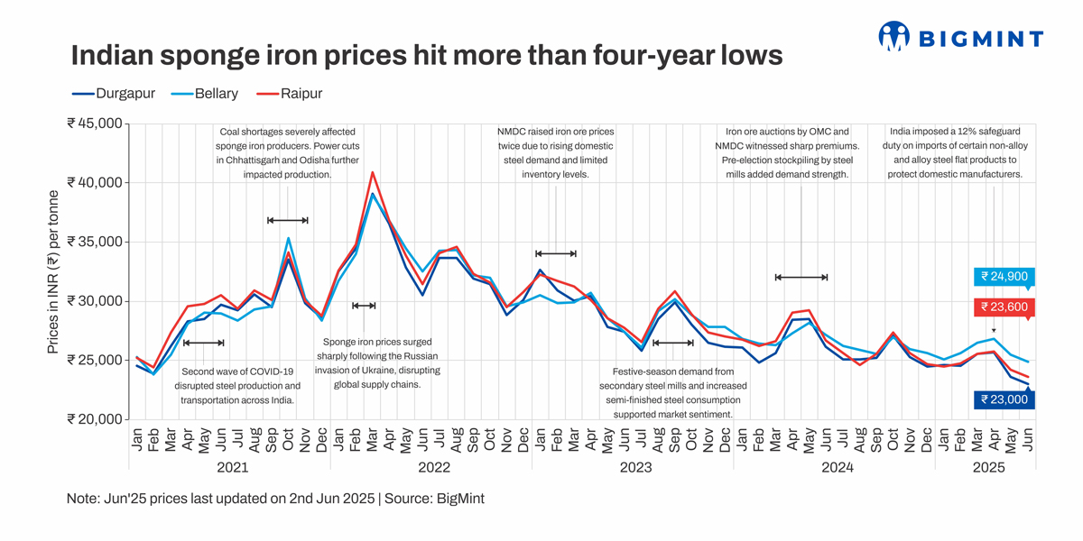 Indian sponge iron prices fall to a 4-year low in May 2025. What next? BigMint analysis
