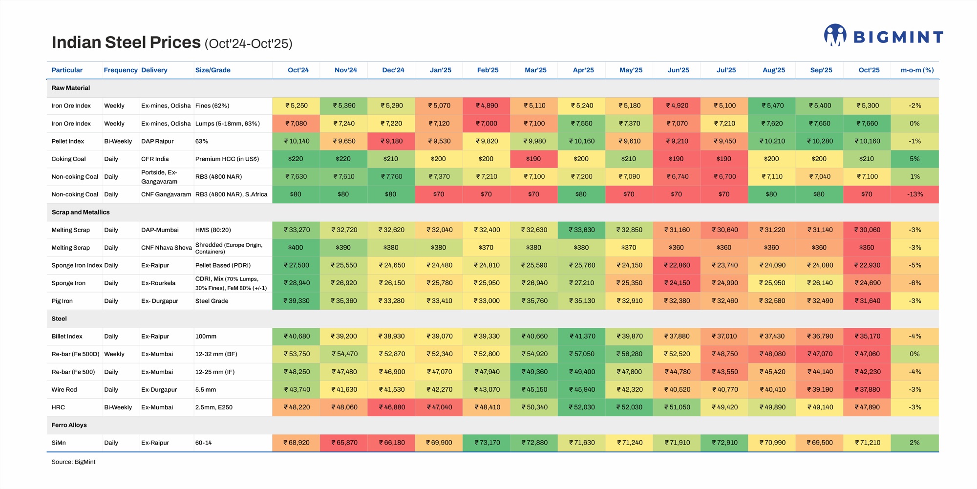 The Indian steel market continued to weaken further in October 2025, with steel and metallics prices declining m-o-m even against the stagnant levels witnessed in September. The sustained decline in steel prices happened at a time when iron ore and coking coal prices have remained relatively firm, thereby piling pressure on producers. The Tier-1 mills had reduced list prices of HRC and CRC in early October and inventory pressure both at the trade level and in mills increased due to subdued activity during the festive period. A slight post-festive rebound has been seen in the longs segment; however, flat steel prices continue to weaken amid muted sentiments and the decline in global steel prices. Domestic prices are at 5-year lows and the bottom is still not in sight.