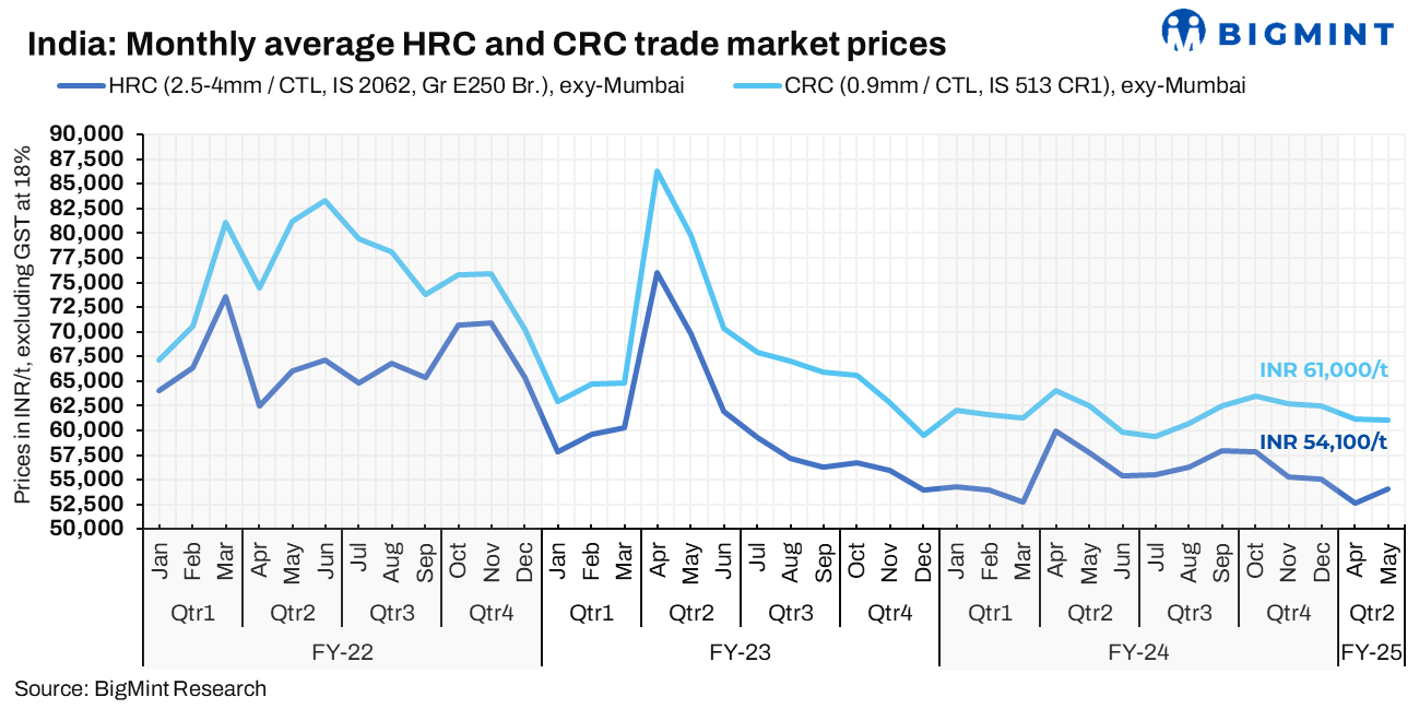 Meanwhile, the average monthly HRC prices have increased to INR 54,100/t (up INR 1,500/t m-o-m) in May 2024. It can be recalled that these prices dropped for five consecutive months from INR 57,900/t in September 2023 to the low of INR 52,600/t in April 2024. The mentioned prices are on an exy-Mumbai basis, and exclude GST at 18%.