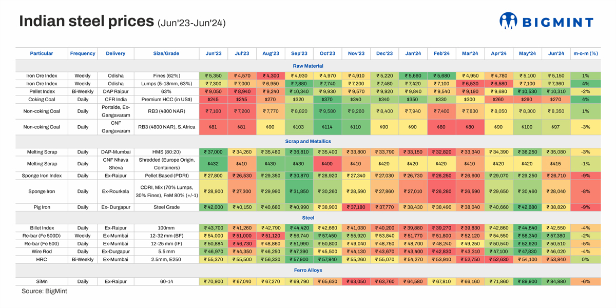 Most steel and raw material prices showed m-o-m decline in June, 2024, reveals data compiled by BigMint. Metallics like sponge and pig iron were hit the most, with both registering the steepest decline in June. Average Australian Premium HCC coking coal prices rose 4% m-o-m to $270/tonne (t) CFR India in June, 2024 from $260/t in June.Indexed port-side ex-Gangavaram prices of RB3 (4800 NAR) from South Africa upped a marginal 1% to INR 8,350/t in June 2024 from INR 8,300/t in May 2024. This same grade of thermal coal, CNF Gangavaram, however, dipped 3% to $97/t in June 2024 from $100/t in May 2024. Prices of the daily 60:14 grade silico manganese index in Raipur dropped by 6% to INR 84,880/t in June 2024 from INR 89,900/t in May 2024.Pellet-based P-DRI, ex-Raipur, fell a substantial 9% m-o-m to INR 26,710/t in June, compared to INR 29,250/t in May.Prices of CDRI with a mix of 70% lumps, 30% fines, FeM 80% (+/-1), ex-Rourkela skidded down 8% m-o-m in June to INR 28,040/t (INR 30,460/t in May 2024).Pig iron prices in June 2024 fell 9% m-o-m to INR 38,820 (INR 42,680/t in May 2024).These fell by 3% m-o-m to INR 35,080/t in June 2024 as compared to INR 36,250/t in May 2024.