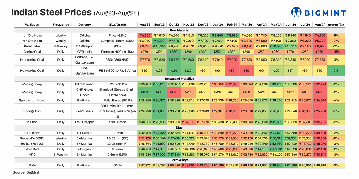 The downtrend in India’s steel and raw material prices continued into August 2024, a month which saw some “deep troughs” akin to July this year. Coking coal and iron ore lumps were the worst hit. In fact, steel and raw material prices dropped across-the-board amid sustained weak domestic demand, high inventory levels, seasonal monsoon effects, global economic uncertainties, and strategic price adjustments by mills.