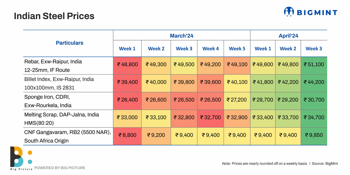 Prices of finished steel are increasing in India on the back of three reasons. One is the production cuts undertaken, especially in longs, from January, which helped to restore the supply-demand imbalance that had been plaguing the market especially since the second half of last year. Secondly, pre-election restocking demand unleashed from March in particular, which helped to keep prices supported. Rising demand, especially for longs, helped to keep demand for scrap as a raw material for induction furnace mills, supported. Thirdly, there is a raw material cost push. The billet index, ex-Raipur, is averaging INR 43,000/t ($516/t) in April against March’s INR 40,000/t ($480/t). Sponge iron, exw-Rourkela, is up at INR 29,500/t ($354/t) in April against INR 26,600/t ($319/t) in March.