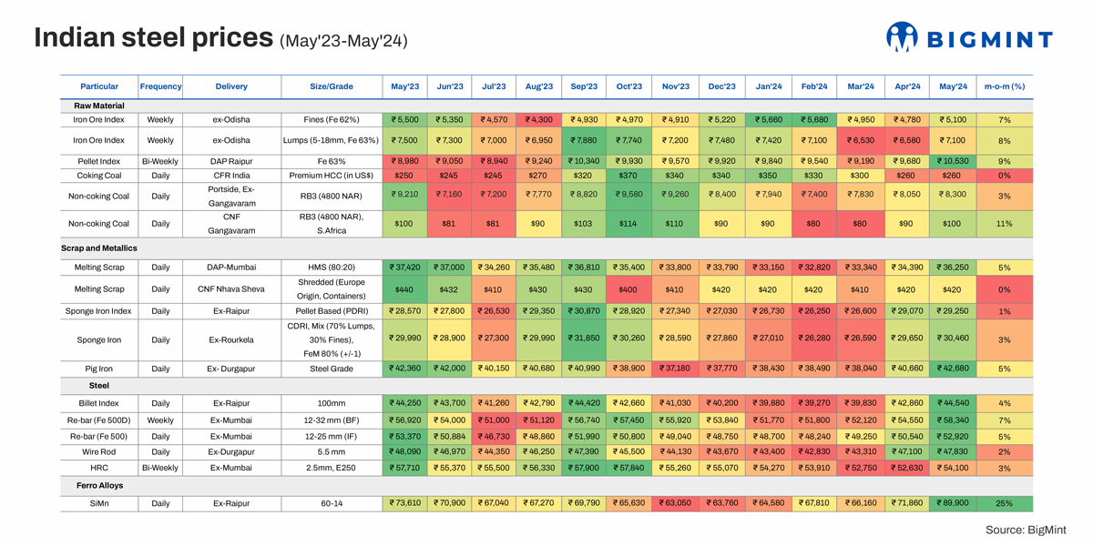 All steel and raw material prices up-trended m-o-m in May, 2024 as the supply-demand imbalance was restored after mills went ahead with production cuts. Imported South African coal rose by 11%, followed by pellets, at 9%. Imported scrap remained flat m-o-m. Finished steel prices may see a further uptick in June although there is a question mark on whether these will get absorbed in the market. In raw materials, Australian coking coal prices are expected to be in a narrow range amid constraint for July laycan cargoes accompanied by falling demand. Also, the met coke safeguard directive keeps buyers uncertain on whether the import restrictions will be imposed or annulled. On the other hand, metallics like sponge, scrap, and iron ore may see an uptrend as finished steel demand is expected to remain good post-election results and inventory depletion.