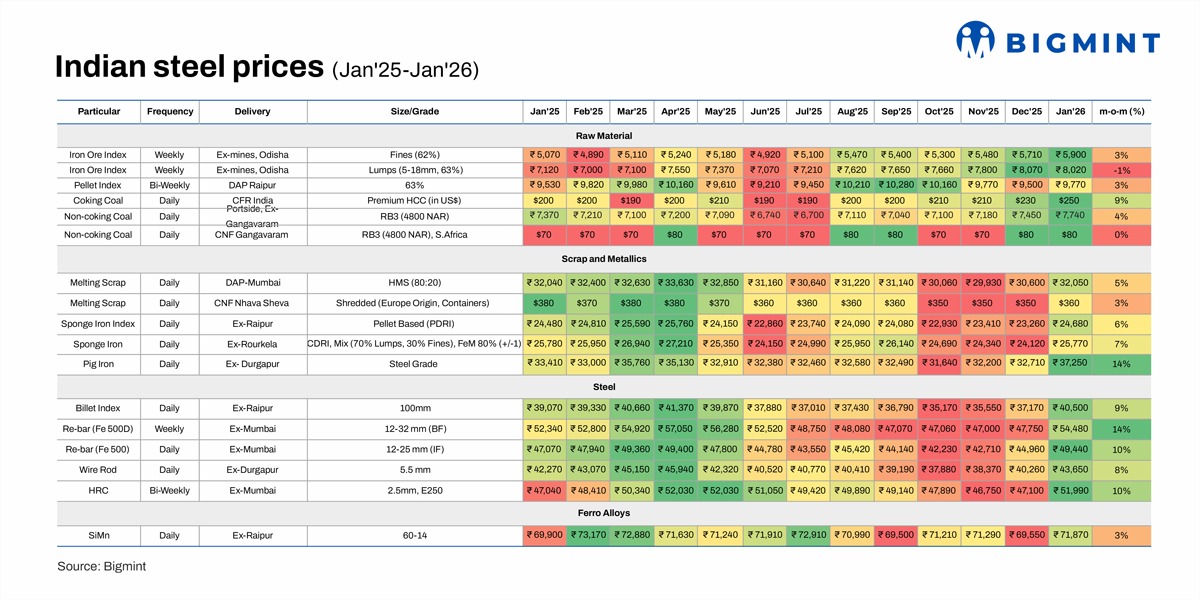 Morning Brief: The domestic steel market witnessed a rally in January 2026 after prices had sunk to five-year lows in November-December. The primary mills raised flat and long steel prices successively throughout the month coinciding with the surge in raw material prices and the implementation of the safeguard duty on steel imports. Sustained inventory depletion throughout the month and brisk activity on the spot market prompted the leading mills to opt for hikes.