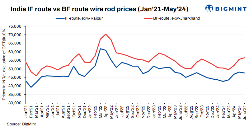 In the BF-segment, wire rod prices (5.5-6mm, SAE1008) rose by INR 3,600/t ($43/t) m-o-m to average of INR 55,600/t ($666/t) exw-Jharkhand in May 2024. Current wire rod prices (5.5-6mm, SAE1008) stood at INR 56,500/t ($677/t) exw-Jharkhand as per BigMint’s assessment on 14 June 2024.