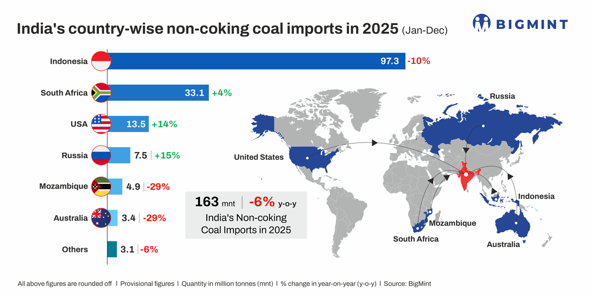 Morning Brief: India’s imports of non-coking coal, used in power generation and in the industrial sector, declined by 6% y-o-y in CY’25, as per latest BigMint data. Imports dropped to around 163 million tonnes (mnt) from over 173 mnt in CY’24.
