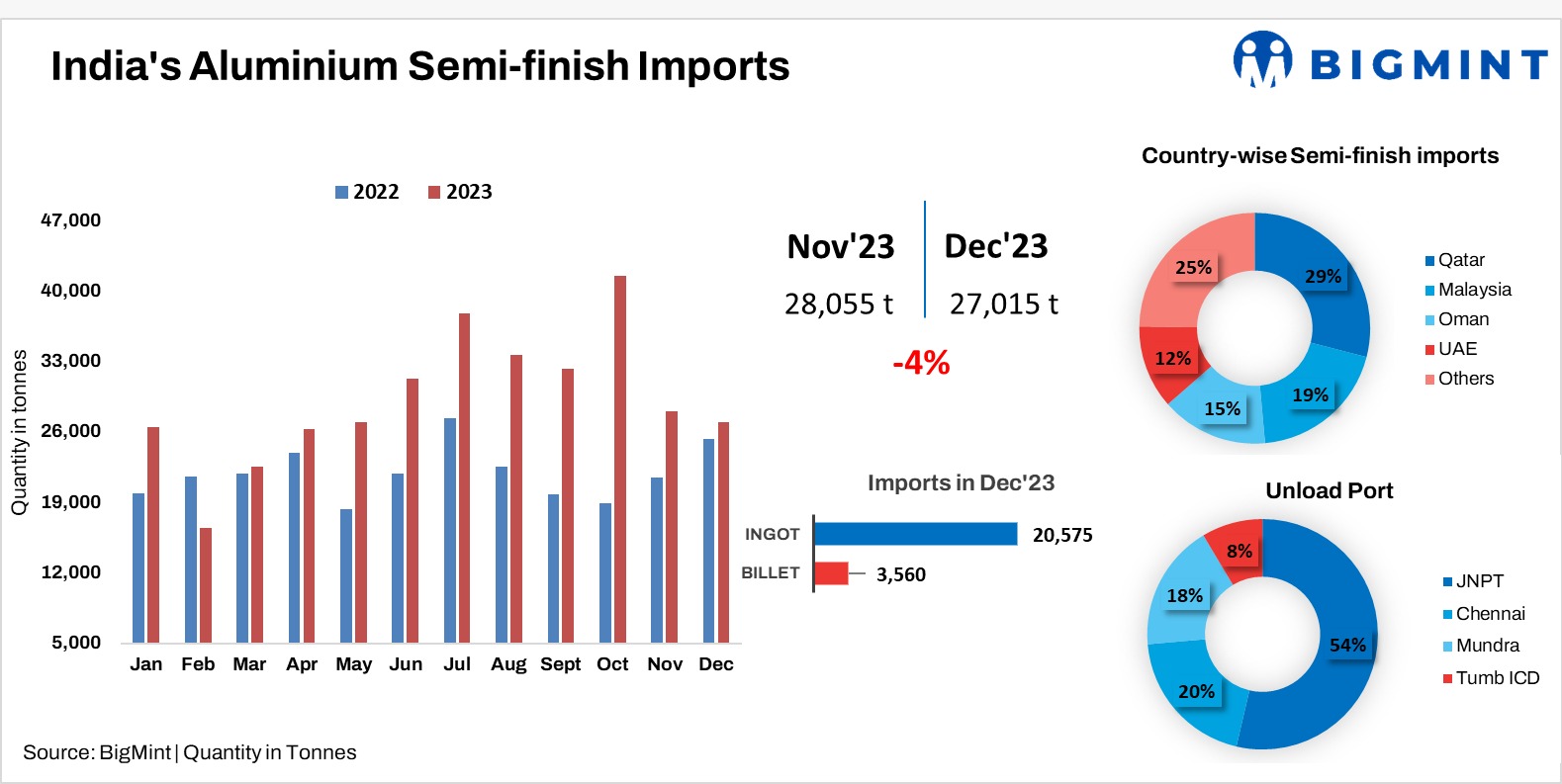 India’s aluminium semi-finish imports fell 4% to 27,015 t in Dec’23 from Nov’s 28,055 t. However, there was a remarkable surge of 33% y-o-y in CY’23. In Dec, ingots dominated imports at 20,575 t (down 10% m-o-m), with Qatar as the primary supplier (6,423 t). Billets followed at 3,560 t (up 35%), with Malaysia leading (1,718 t). JNPT recorded highest material unloading in Dec’23 with 12,441 t.