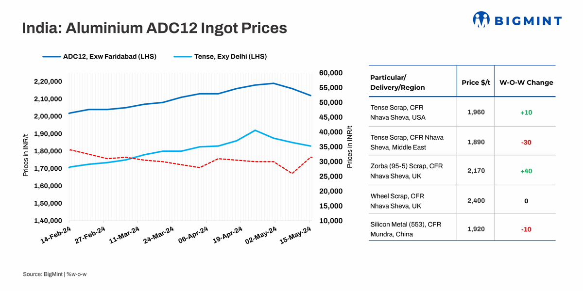 BigMint’s assessment for spot prices of aluminium ADC12 alloy ingot saw a fall of INR 4,000/tonne (t) to INR 212,000/t w-o-w exw-Delhi NCR. Notably, tense scrap prices were at INR 183,000/t ex-Delhi, marking a weekly decrease of INR 2,000/t. The scrap-to-ADC12 spread was recorded at INR 29,000-30,000/t.