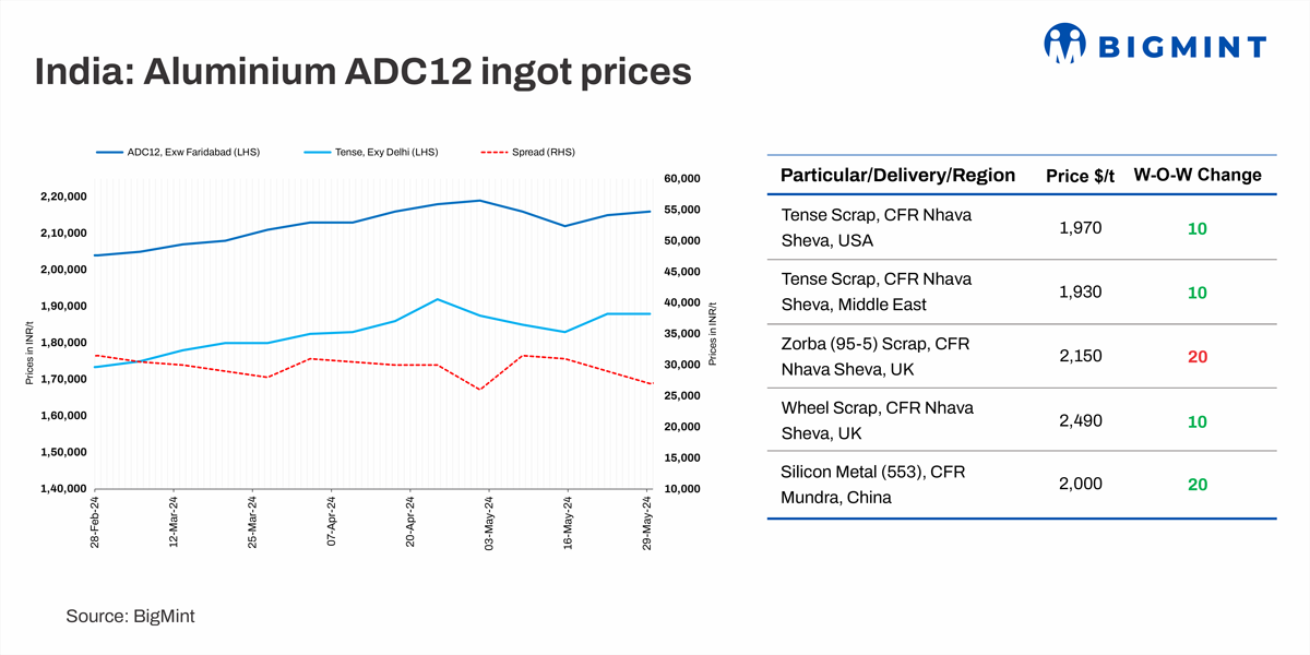 BigMint’s assessment for spot prices of aluminium ADC12 alloy ingots show a marginal gain of INR 1,000/tonne (t) to INR 216,000/t w-o-w exw-Delhi NCR. Notably, tense scrap prices are at INR 188,000/t ex-Delhi, marking a weekly increase of INR 1,000/t. The scrap-to-ADC12 spread was recorded at INR 28,000-29,000/t.
