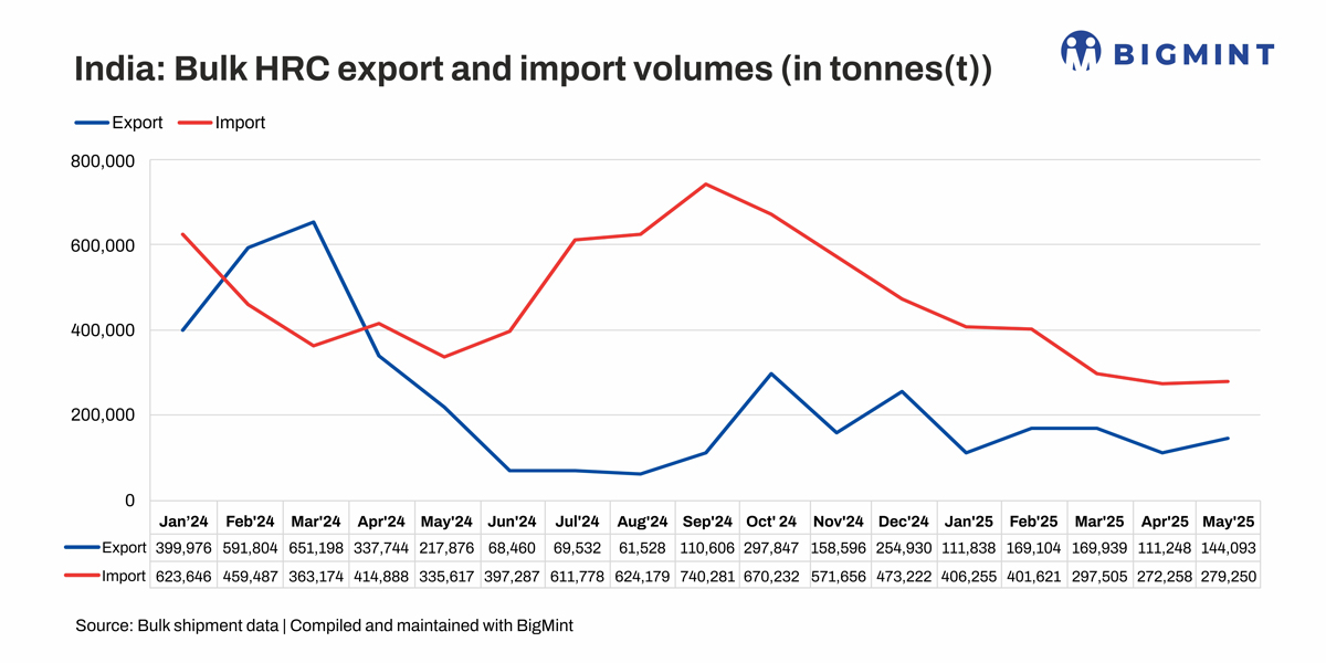 India’s bulk hot-rolled coil (HRC) imports in May 2025 stood at 279,250 tonnes (t), a 17% y-o-y decrease from 335,617 t in May 2024, according to BigMint data. But imports inched up 3% m-o-m against 272,258 t in April.