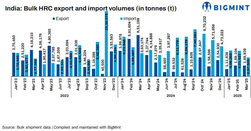 India’s bulk HRC export volumes declined 74% y-o-y in March to 169,939 t compared to 651,198 t in March 2024.