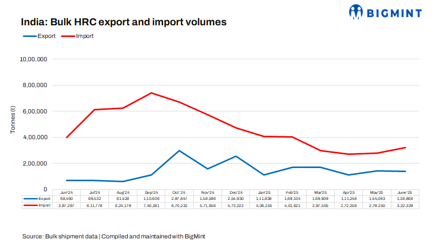On the export front, India’s bulk HRC export volumes surged by 103% y-o-y in June 2025 to 138,868 t compared to 68,460 t in June 2024.