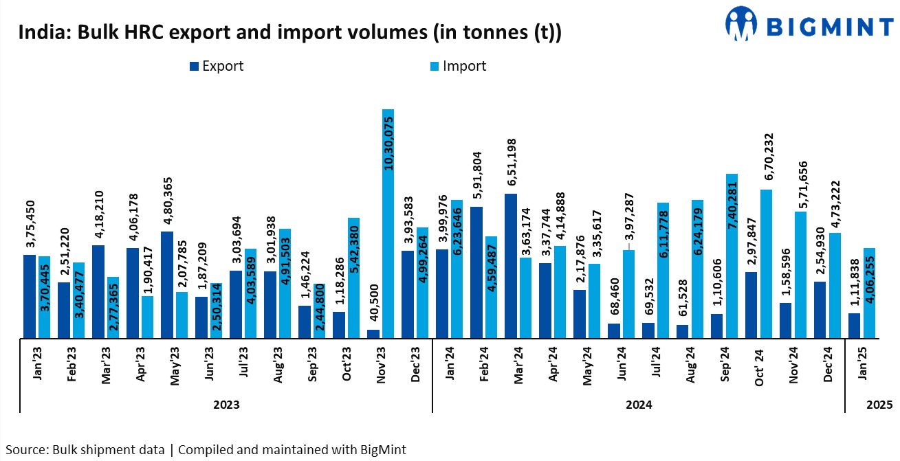 On the export front, India’s bulk HRC export volumes declined 72% y-o-y in January to 111,838 t compared to 399,976 t in January 2024. In addition, volumes dropped by 56% m-o-m compared to 254,930 t in December 2024.