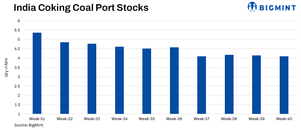 Coking coal stocks at major Indian ports fell by 1.3% w-o-w, totalling around 4.09 million tonnes (mnt) in week 40 of the calendar year 2024 (CY’24), compared to 4.14 mnt in week 39, as per BigMint’s data.