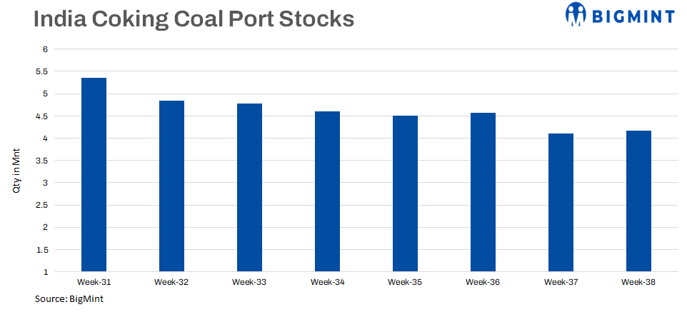 Coking coal stocks at major Indian ports were assessed at around 4.17 million tonnes (mnt) in week 38 of CY’24, a slight increase of 1.78% from 4.1 mnt in week 37, according to BigMint’s data.