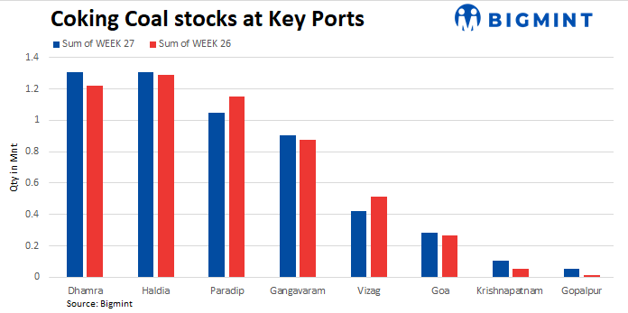 • At Haldia Port coking coal stocks increased by 1.05% w-o-w to 1.30 mnt in week 27 from 1.29 mnt in week 26