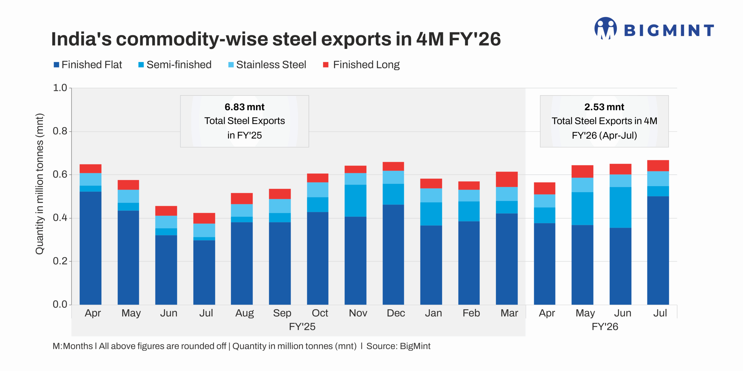 Finished flats (carbon steel) exports edged up by 2%y-o-y to 1.60 mnt, largely due to a considerable 56% rise in CRC shipmentsto 259,000. Pipes and tubes witnessed a moderate 7% increaseto 505,000 t, with the UAE, US, and EU seeing major hikes. Pipes and tubes exports surpassed HRC/plate shipments, with the latter falling 8% to 457,000 t.HRC/plate exports to the EU increased 34%, but this came at the expense of near nil shipments to the UK. Exports to Nepal declined by 7% and to the UAE by 16%.