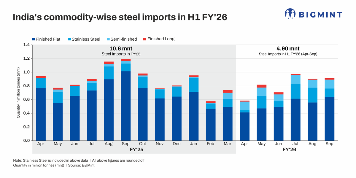 India’s finished flat carbon steel imports stood at 3.19 mnt in H1FY’26, down by a steep 31% y-o-y. Hot-rolled coil (HRC) arrivals declined by 40% to 1.39 mnt, hit by the safeguard duty. Galvanised steel and electrical steel were down 25% and 23%, respectively. Semi-finished imports increased by over 400% to 0.77 mnt. This was the only category to witness a strong increase.