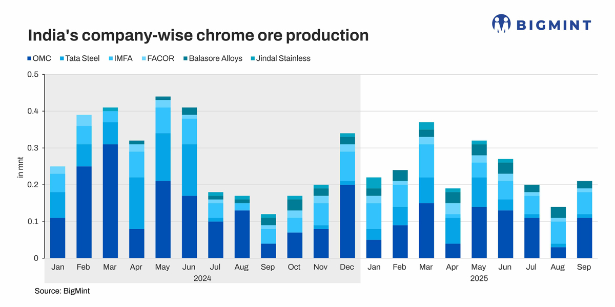Chrome ore production saw an 18% y-o-y decline from 1.64 mnt to 1.34 mnt in H1FY’26. Indias biggest chrome miner, OMC, recorded output at 0.57 mnt in H1, a decrease of 20% from 0.71 mnt in H1FY’25. Production was impacted during the extended monsoon period from July to early October due to waterlogging in mines, as well as weak steel market conditions and prices.