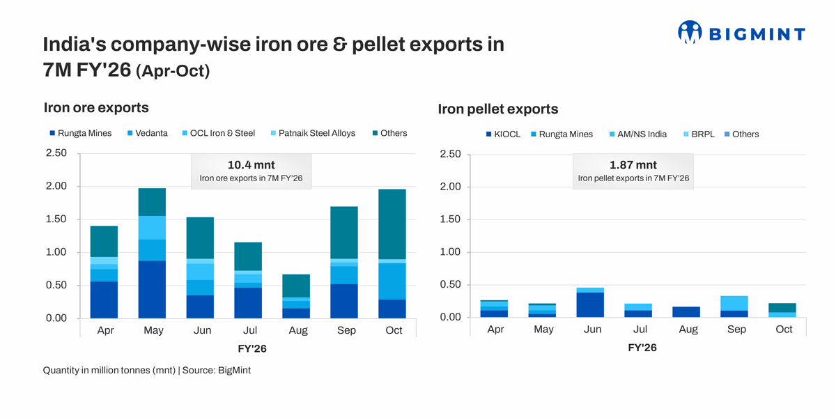 The major iron ore exporting companies were Vedanta (0.55 mnt), Rungta Mines (0.29 mnt) and Grewal Minerals and Metals (0.17 mnt). The leading pellet exporters from India were AM/NS India (0.08 mnt) and Lloyds Metals & Energy (0.06 mnt).