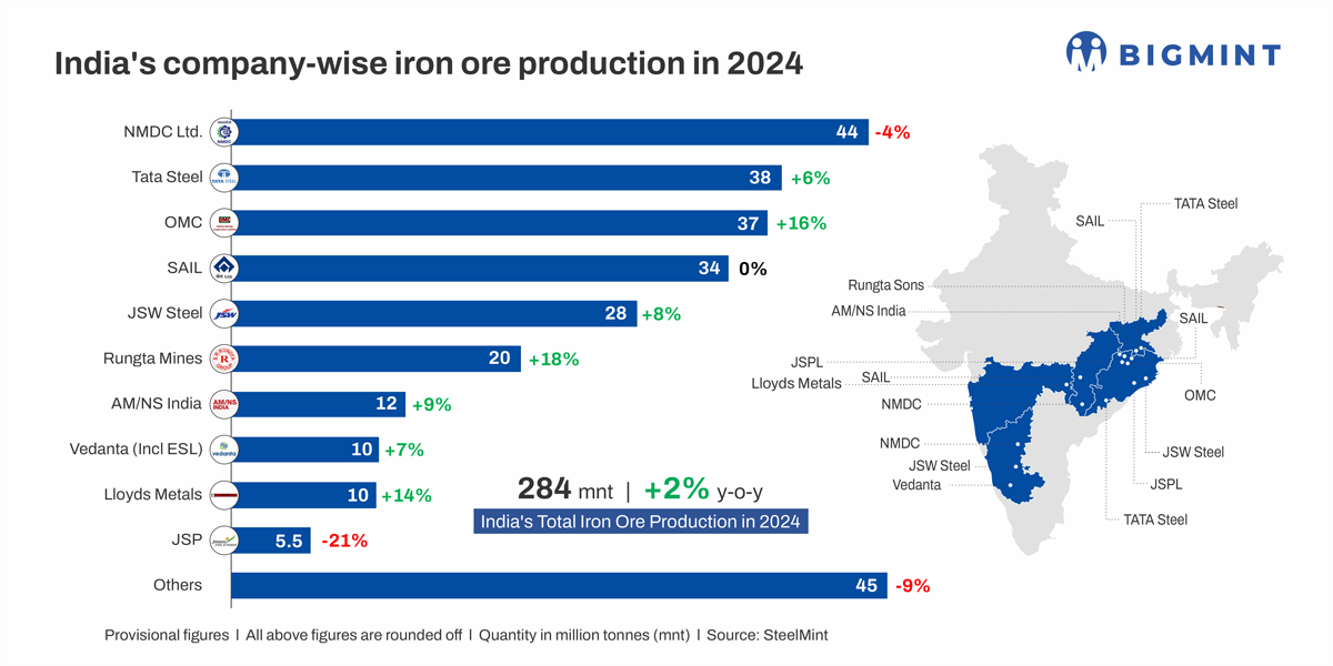 Iron ore production in India is projected to have increased by around 2% y-o-y to reach 284 million tonnes (mnt) in calendar year 2024 (CY’24), as per provisional data available with BigMint. Iron ore production in CY’23 stood at 279 mnt. NMDC remained the top iron ore miner in the country in CY’24, although total production declined by 4%y-o-y to 44 mnt compared to 46 mnt in CY’23. This was mainly due to the employees’ agitation at NMDC in May 2024 and thereafter centering around wage revision which impacted operations. Integrated steel producer Tata Steel achieved a 6% growth in production, with output touching 38 mnt, while OMC clocked total production at 37 mnt, an impressive 16% higher y-o-y.
