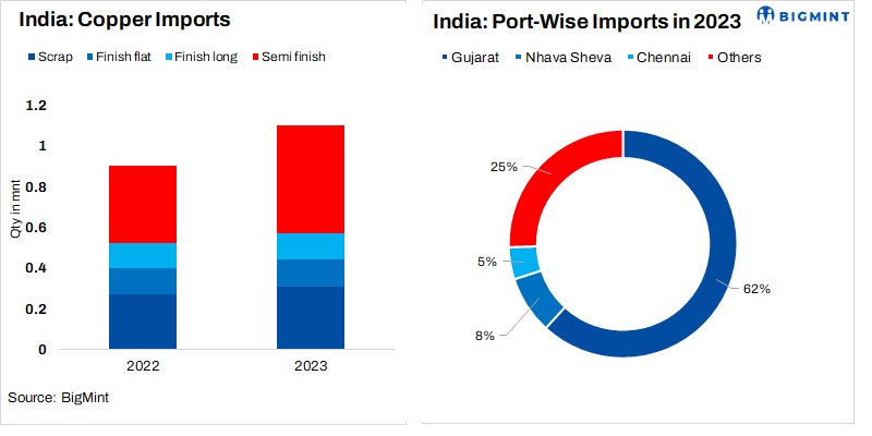 India’s copper imports were recorded at 1.10 mnt in CY’23 as against 0.90 mnt in CY’22, an increase of 22% y-o-y. Japan was the top exporter with 0.23 mnt followed by Zambia at 0.20 mnt. The highest imported commodity by volume was semi-finished products at 0.53 mnt, with most cargoes (around 0.36 mnt) arriving at the Tumb ICD in Gujarat.