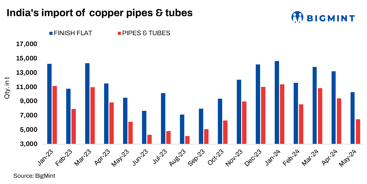 India’s copper imports for finished flat products decreased by 22% m-on-m to 10,271 t in May’24. Imports for pipes and tubes grade decreased by 31% m-o-m to 6,482 t in May’24. Meanwhile, there was an 8% y-o-y increase in imports of finished flat products, Moreover there was a 6% y-o-y increase in imports of pipe and tube grade scrap, as per data maintained by BigMint.