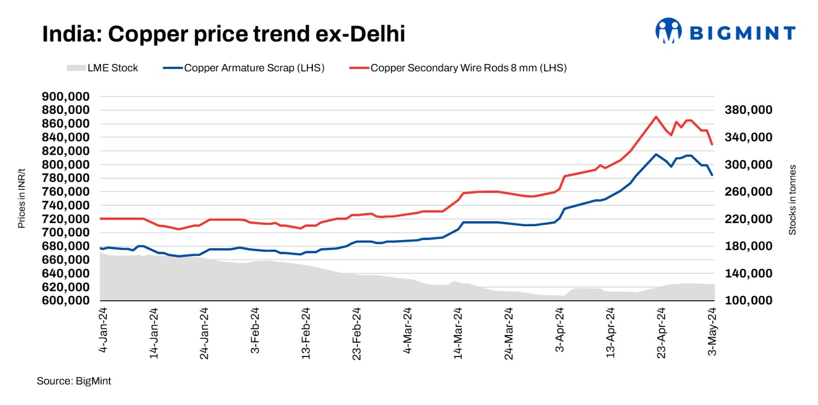 Domestic copper armature prices have been reported at INR 785,000/t, exy-Delhi. Prices of secondary CCR rods (99%) were at INR 830,000/t ex Delhi, falling by 2.4% w-o-w. Meanwhile, primary CC rods were observed at INR 857,000/t, down by 1.5% as buyers remained cautious and opted a wait-and-watch strategy for prices to move further down. Copper motors mix from the US was traded at $1,270/t CIF Pakistan, recently.